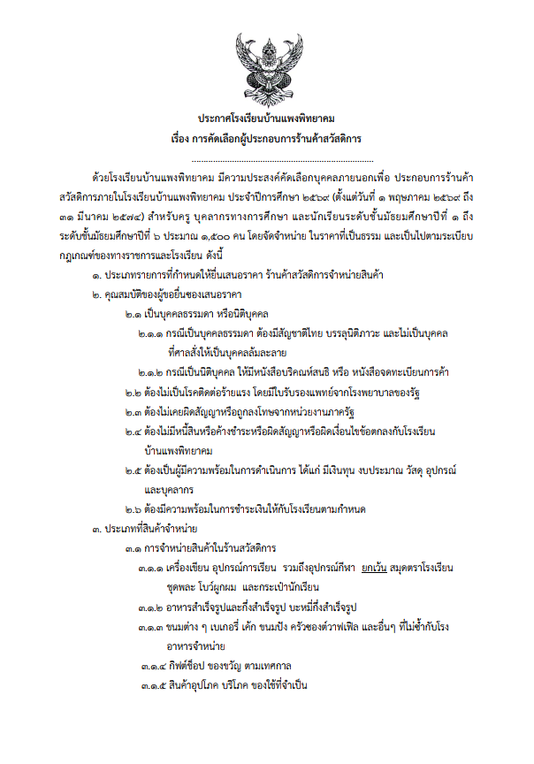 ประกาศโรงเรียนบ้านแพงพิทยาคม เรื่อง การคัดเลือกผู้ประกอบการร้านค้าสวัสดิการ